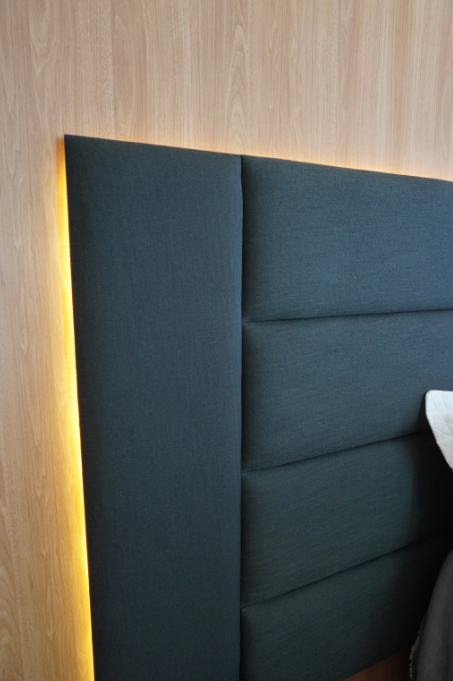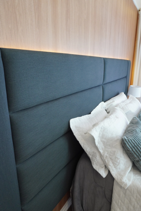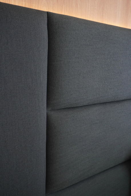• Tapizada en tela lino, conocida por su textura natural, suavidad y resistencia